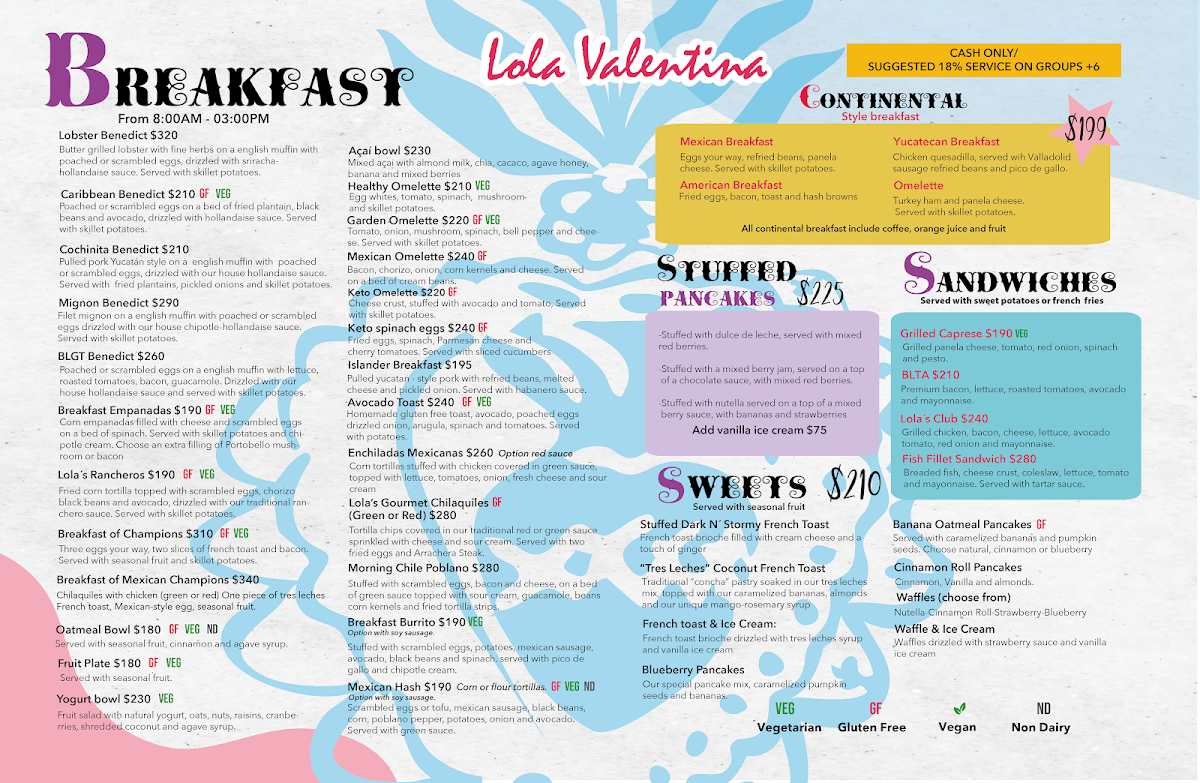 Lola Valentina, nestled in the heart of Isla Mujeres at Miguel Hidalgo, offers a vibrant and diverse menu that delights both locals and visitors alike. Known for its standout breakfast empanadas, which perfectly combine flaky dough with flavorful fillings, this spot energizes your mornings. Their green cleanser smoothie, often paired with mimosas, makes for a refreshing start. The menu shines with fresh ceviche, crispy shrimp tempura, and inventive Mexican bowls that balance taste and presentation beautifully.